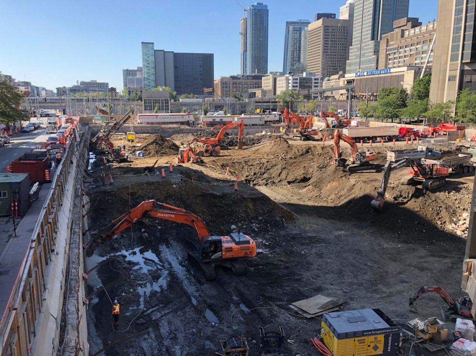 Travaux d’excavation pour la construction du nouveau siège social de la Banque Nationale, au 800, rue Saint-Jacques, à Montréal. Le mandat d’excavation profonde a été réalisé en même temps que l’excavation du projet Victoria sur le parc, au 700, rue Saint-Jacques.